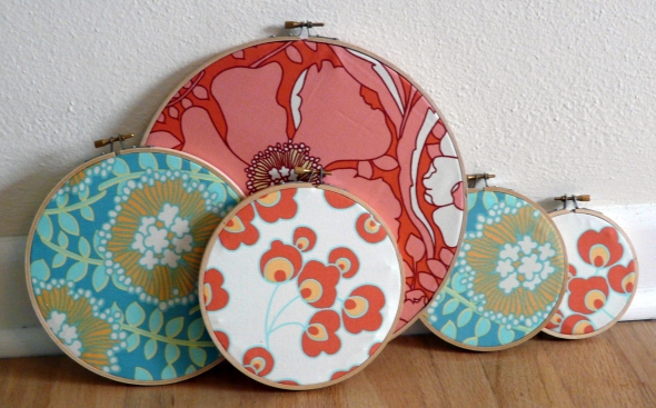 What an interesting way it is to use to use fabric with stitching frames as wall decoration. These embroidery wooden frames will lock the fabric tightly giving a firm look. Variable sizes of framse can be used to create fabric wll decoration of a unique kind.