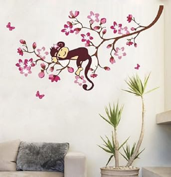 Sleeping Monkey on Pink Flower Tree Wall Art Sticker is ideal for kids bedroom or baby nursery.